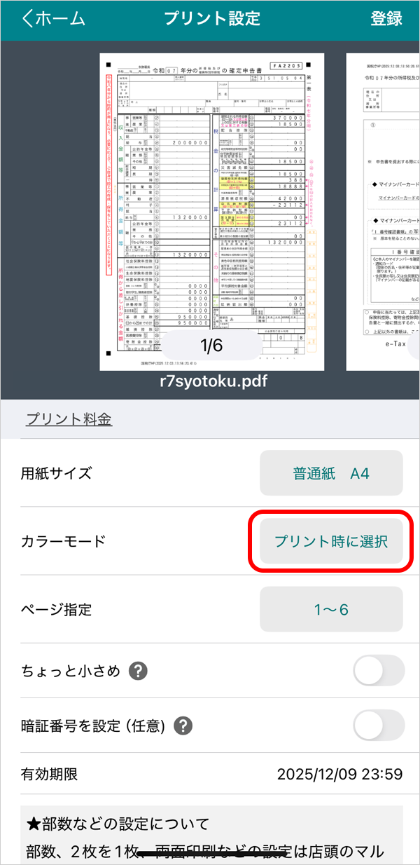 カラーモードの項目の「プリント時に選択」ボタンをタップして、カラーモードを白黒に変更します。
