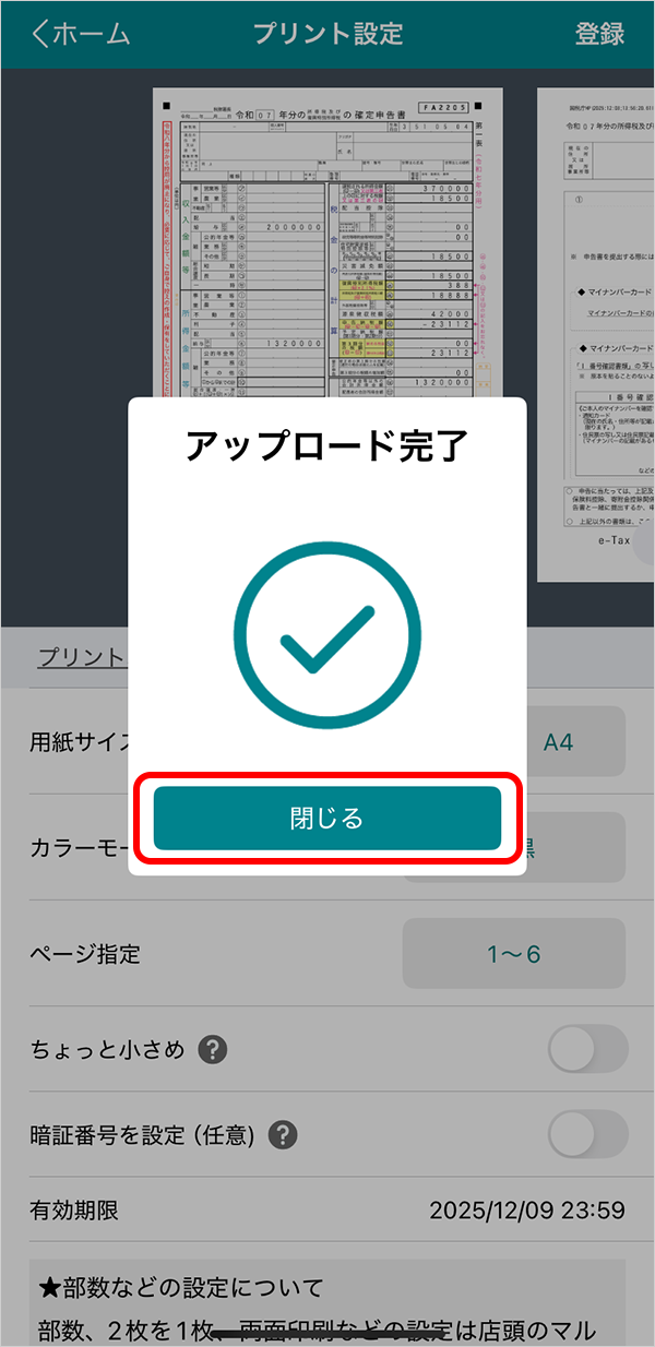 アップロードが完了したら「閉じる」をタップします。
