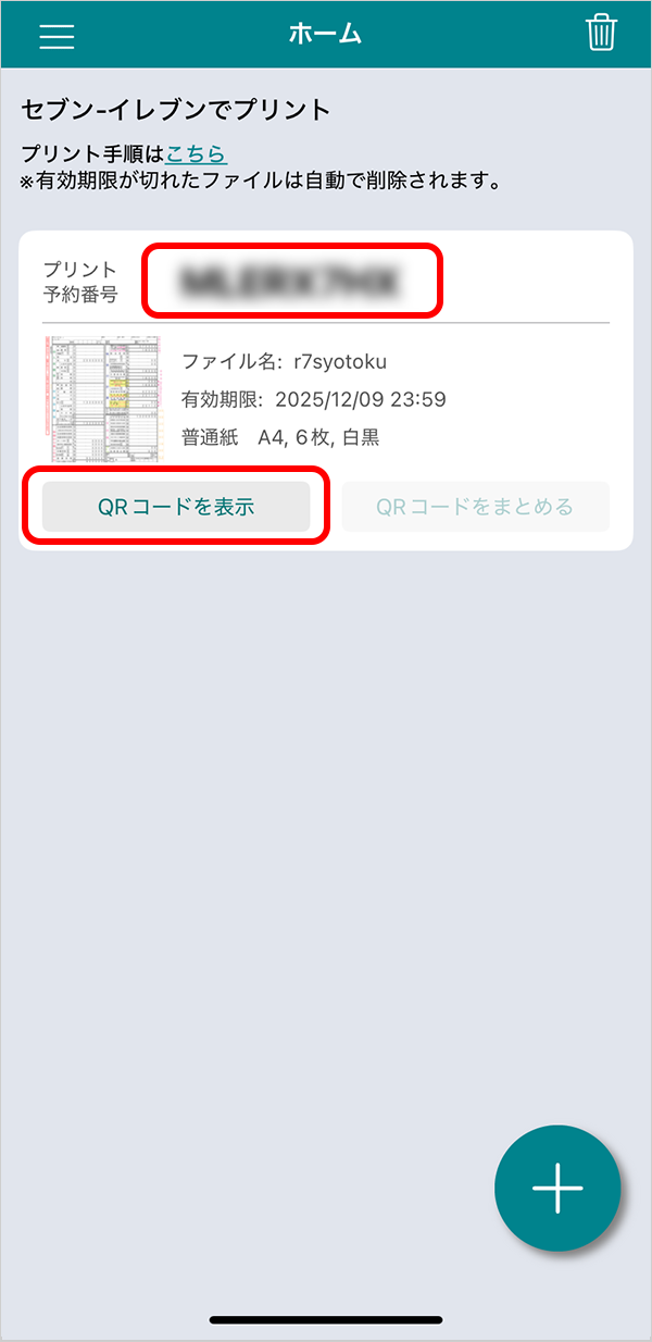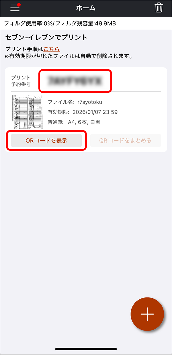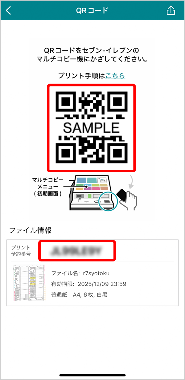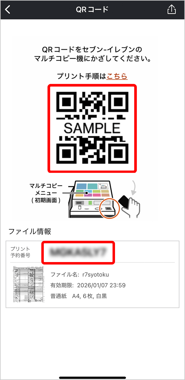 プリント予約番号をメモするか、「QRコードを表示」をタップして QRコードを取得してください。