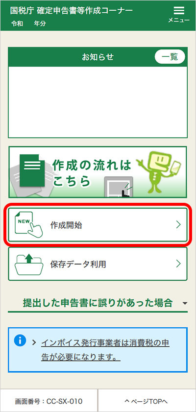 国税庁ホームページの「確定申告書等作成コーナー」の「作成開始」ボタンをタップし、確定申告書を作成します。