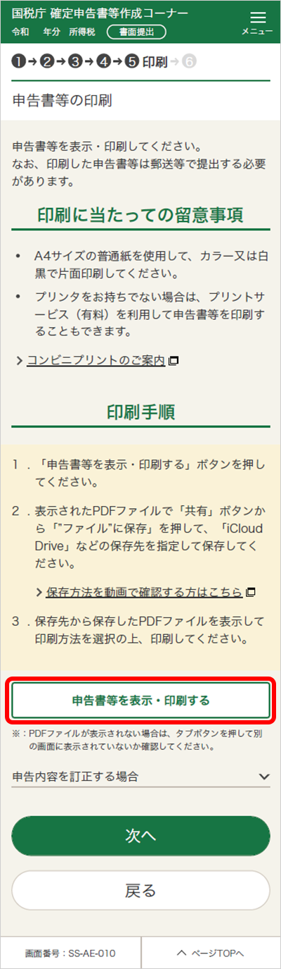 ブラウザに表示されている「申告書等の印刷」画面に戻り、「次へ」ボタンをタップしてください。