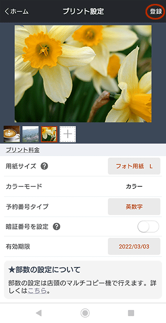 - 「用紙サイズ」や「カラーモード」などを選択した後に、「登録」をタップします。