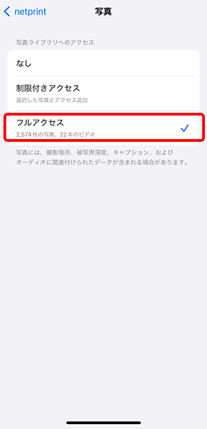 | 制限付きアクセス | 端末に保存した写真の中からnetprintアプリがアクセスできる写真(プリントできる写真)を都度変更する必要があります。 カメラで撮影した後、アクセスできる写真を設定してから、netprintアプリでプリントする写真を選択する必要があります。 |